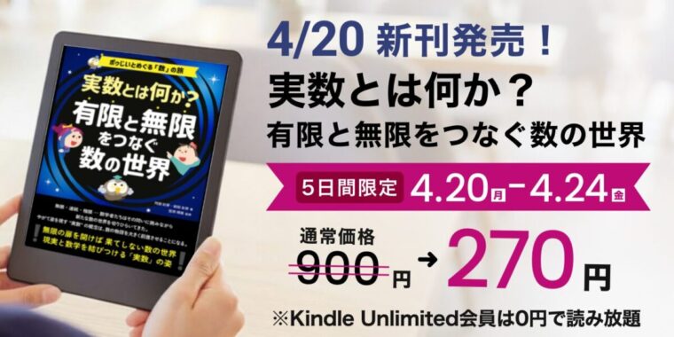 本日4月20日(月)、ポゥじいとめぐる「数」の旅シリーズの第3巻となる電子書籍『実数とは何か? 有限と無限をつなぐ数の世界』を、Amazon Kindleにて発売いたしました。